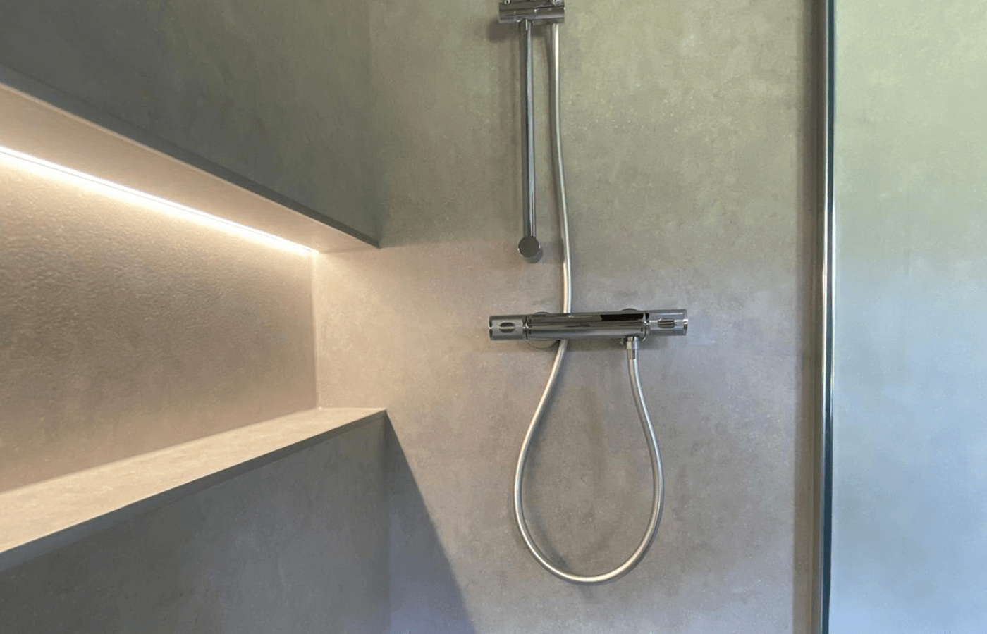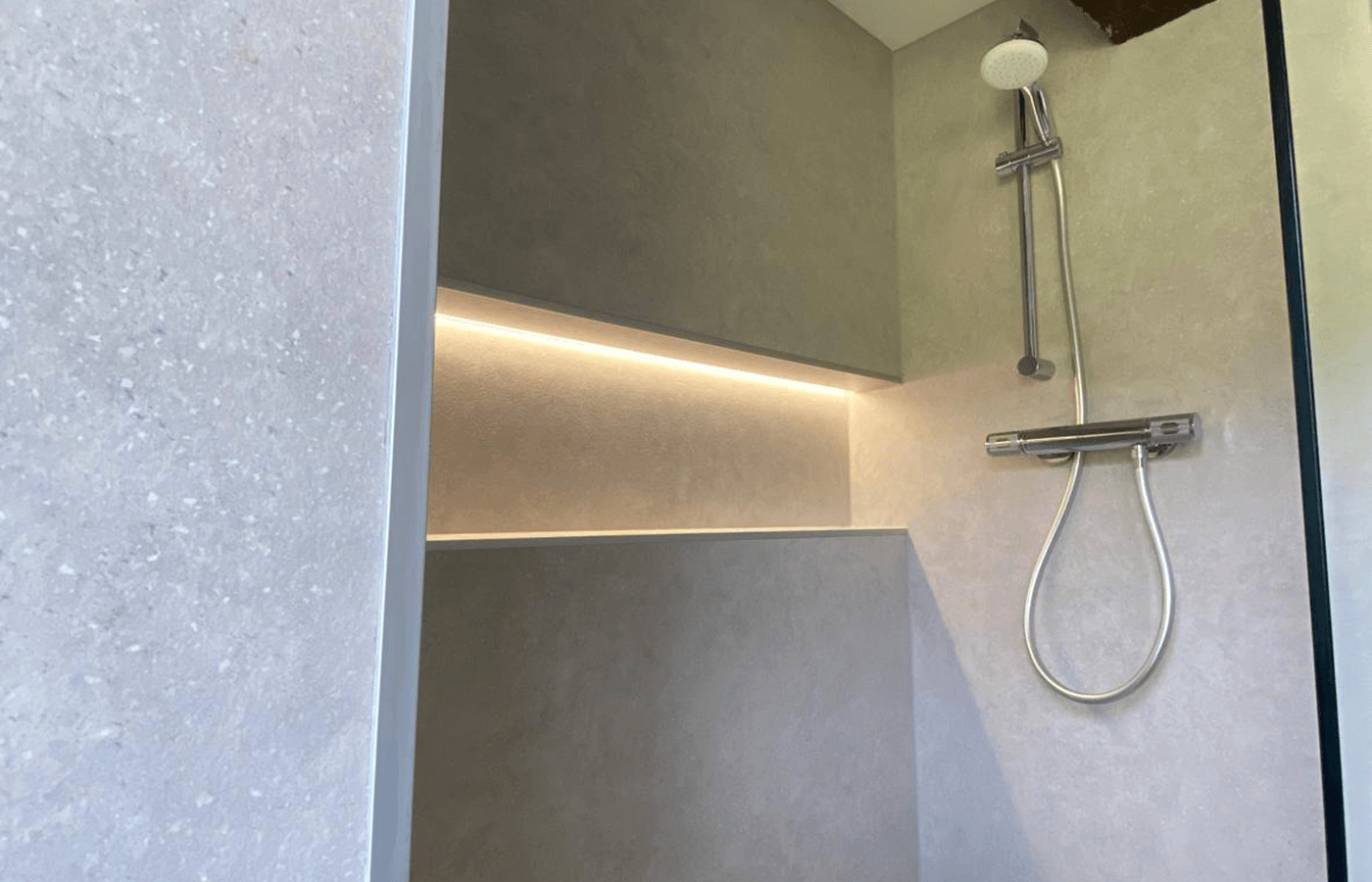 Custom-built illuminated shelving recessed into the shower wall