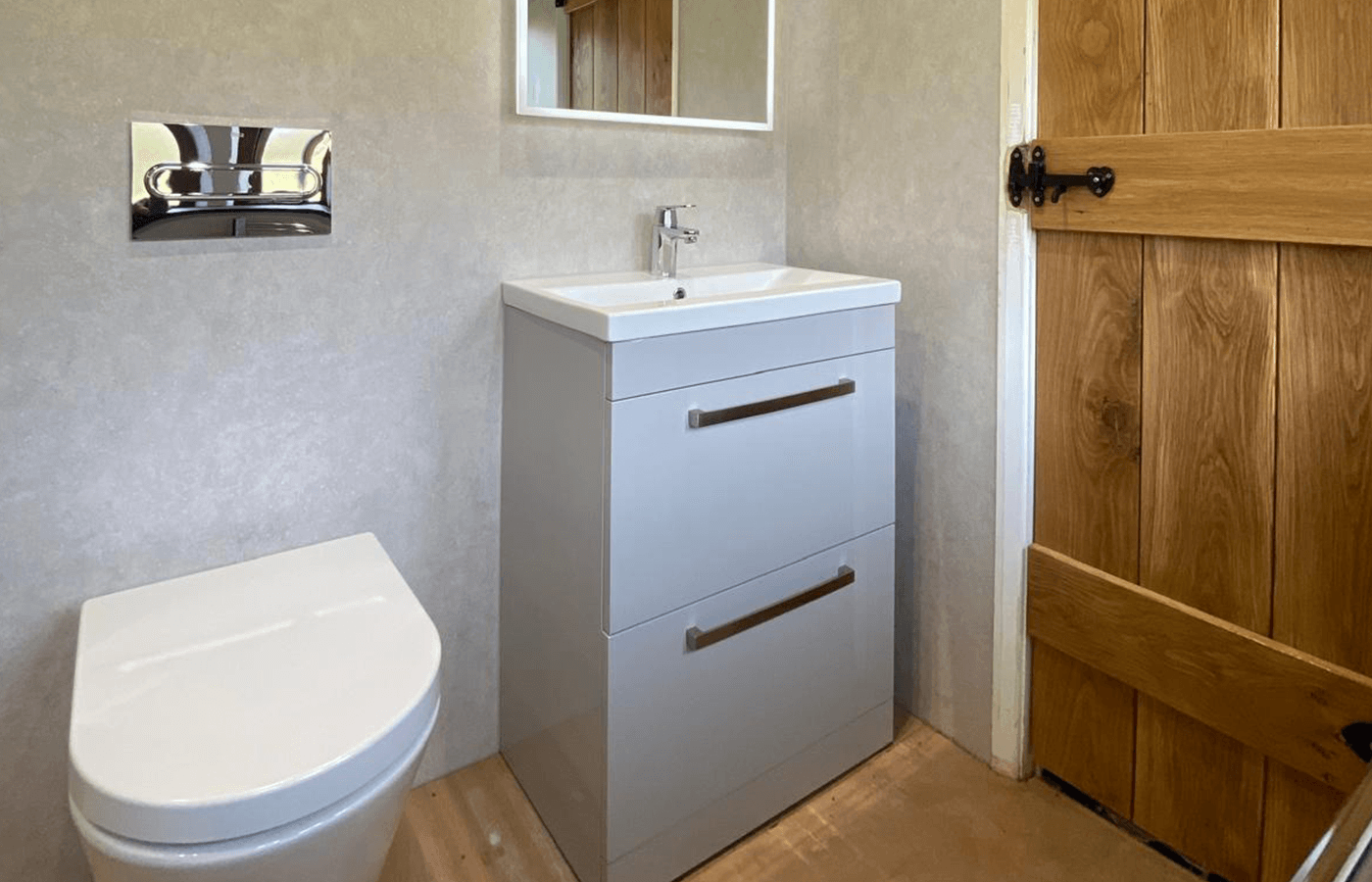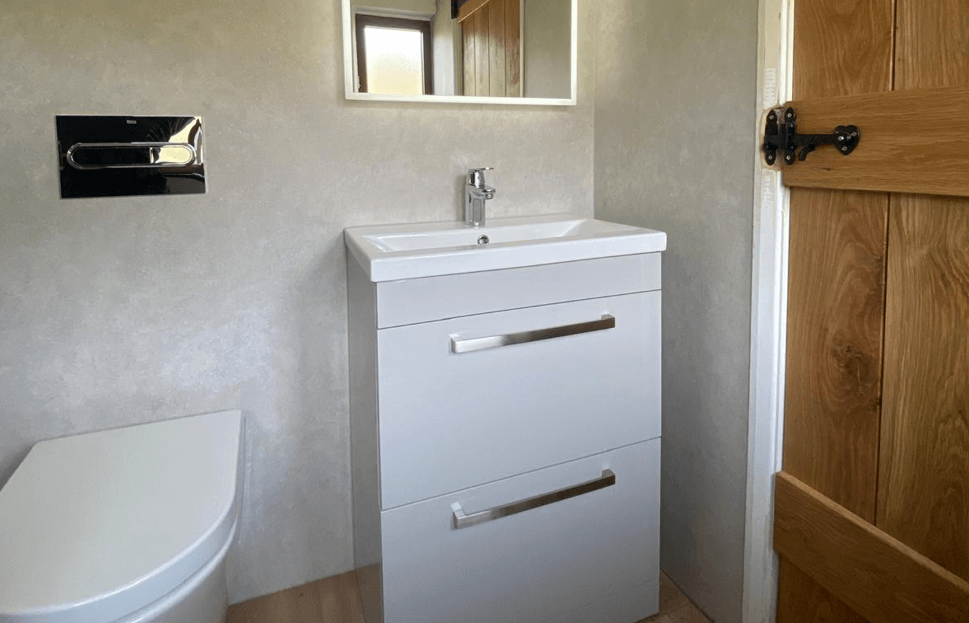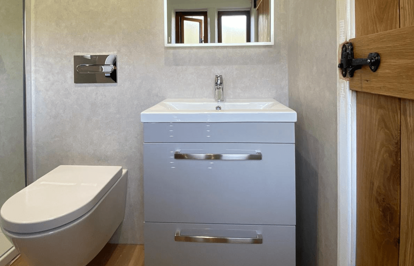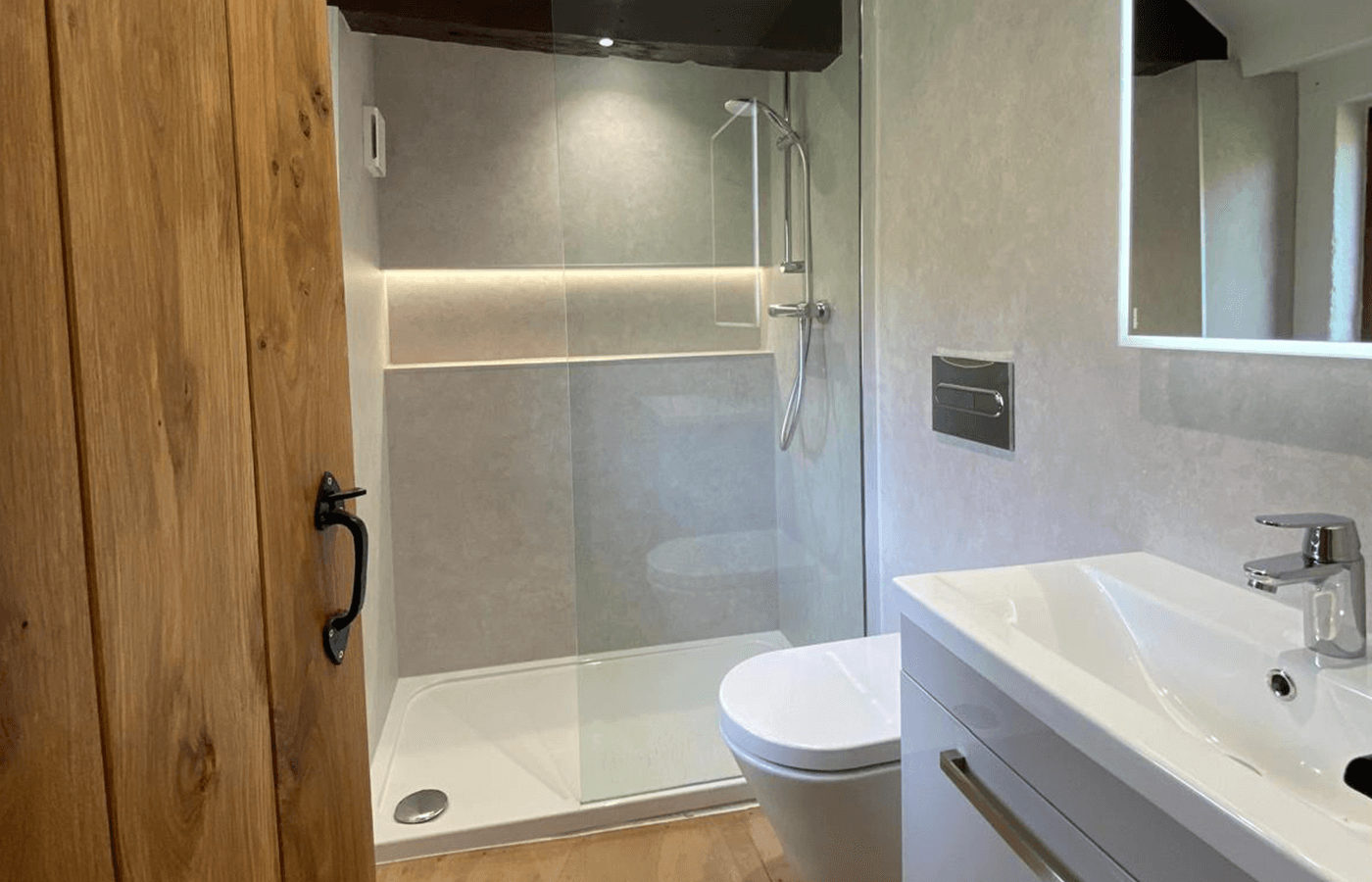 Despite the space limitations, thoughtful design choices created an open and inviting atmosphere. The lit-up shelving in the shower provides both storage and a soft glow that enhances the showering experience. The LED mirror not only improves lighting for daily routines but also adds a modern touch. Neutral wall panels and clean lines further contribute to the sense of space and calm.